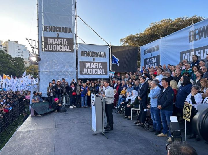 Para finalizar el acto tomó la palabra el gobernador de la provincia de Buenos Aires Axel Kicillof. Habló como algo más que candidato a la reelección en la provincia. Entre sus principales pasajes, en medio de una ovación destacada del resto de los oradores, sostuvo respecto al Poder Judicial que “esta es la corte del 2×1 que le daba beneficios a los genocidas y también se la frenó con el pueblo en la calle. No podemos vivir con una democracia de rodillas. Cuando no tienen los votos gobiernan con los fallos”. En otro pasaje agregó que “se manotean la guita de los que menos tienen para dársela al poder concentrado. No vamos a permitir que les saquen los recursos a nuestro pueblo y a nuestros pueblos” en relación a proscripción de CFK aseguró que “es ella quien conduce el campo popular” y enfatizó que “Si Cristina quiere y el pueblo la acompaña va a volver a ocupar cargos”.